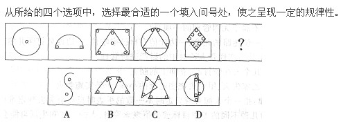 2.B【解析】题干图形有一个很显著的共同点就是均有一些小圆圈,且小圆圈的个数与图形的复杂程度相关。本题规律为题干图形中小圆圈的个数与其他线条的数量相等,选项中只有B符合。