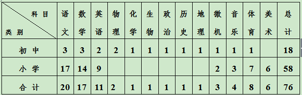 本次拟公开招聘教师共76名:初中18名,小学58名。具体学科计划如下: